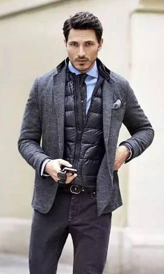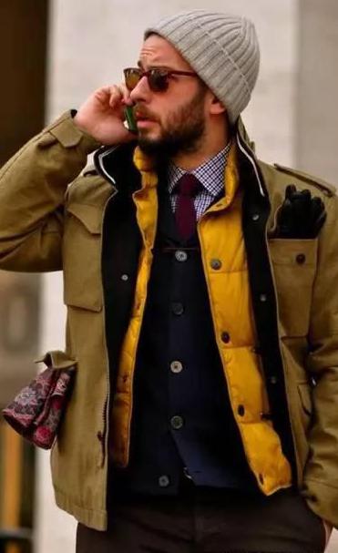 和前一套造型相比,以羽绒背心直接替代了西装背心,利用单品长短的不同轻易创造出不显胖的多层次穿搭。选择羽绒背心也是利用该造型的巧妙之处,若中间穿着有袖羽绒外套,手臂处可能就会太臃肿。而利用抢眼的亮黄羽绒背心搭出视觉焦点,完美混搭正装与outdoor风格。