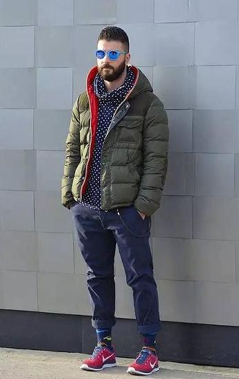 不管是蓝色、绿色,还是灰色羽绒外套,内搭色彩格纹衬衫,衬搭既增加保暖度又避免了搭配的单调感,下身搭配直筒裤装以及一双简约运动鞋,没有一丝臃肿感。
