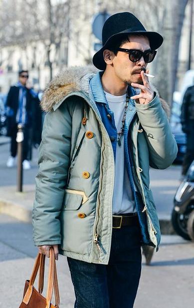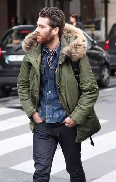 以粗犷的丹宁作为内搭的穿法,更显粗犷味道,但由于绅士帽或者领巾的加入,带回些许成熟优雅质感。